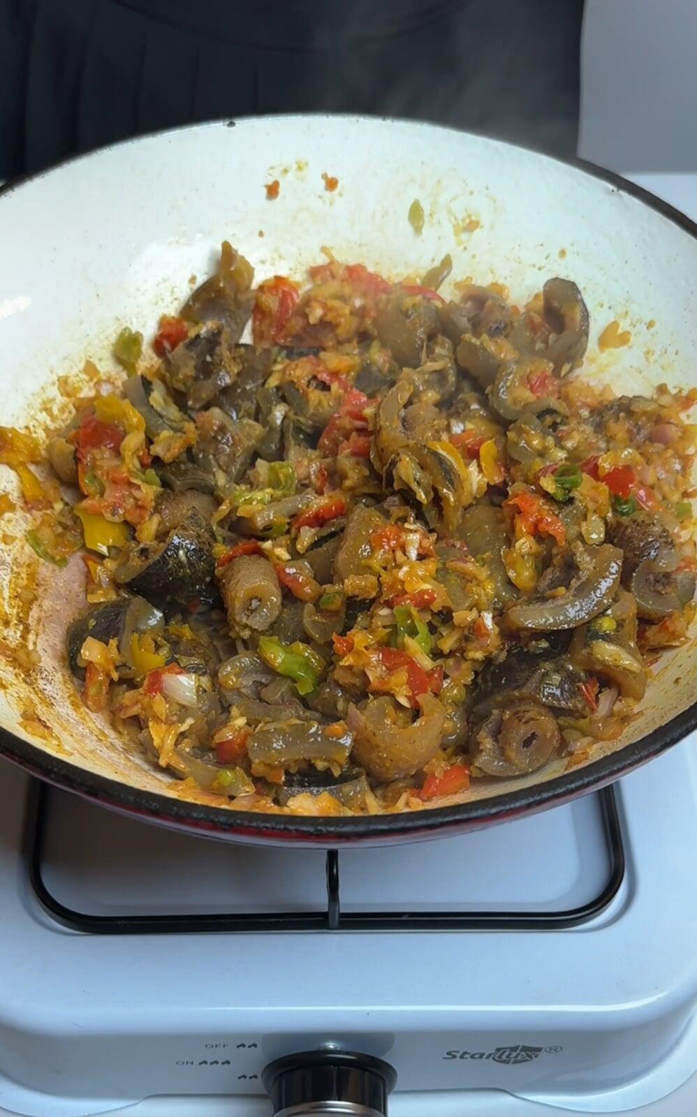 1. Pour the pre-cooked ponmo into the pepper sauce.